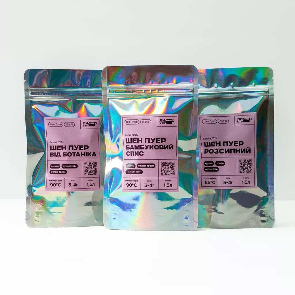 Шен Пуер Бамбуковий спис, 50г - створено невеликим фермерським господарством у місті Менхай, провінція Юньнань. Для виробництва використано весняне листя 2019 року з чайних дерев — велике, щільне, із черенками, що надає напою насиченої текстури. Чай спресовано у млинці середньої щільності, що дозволяє йому швидко “дихати” і рівномірно розкриватися під час заварювання.