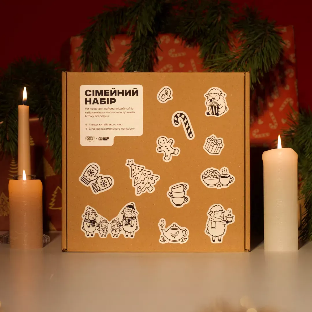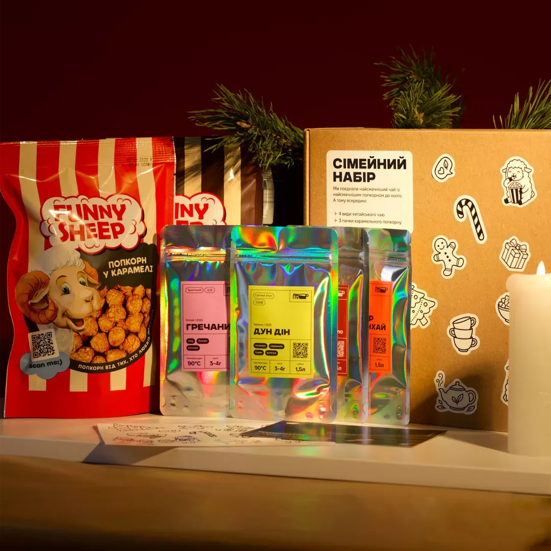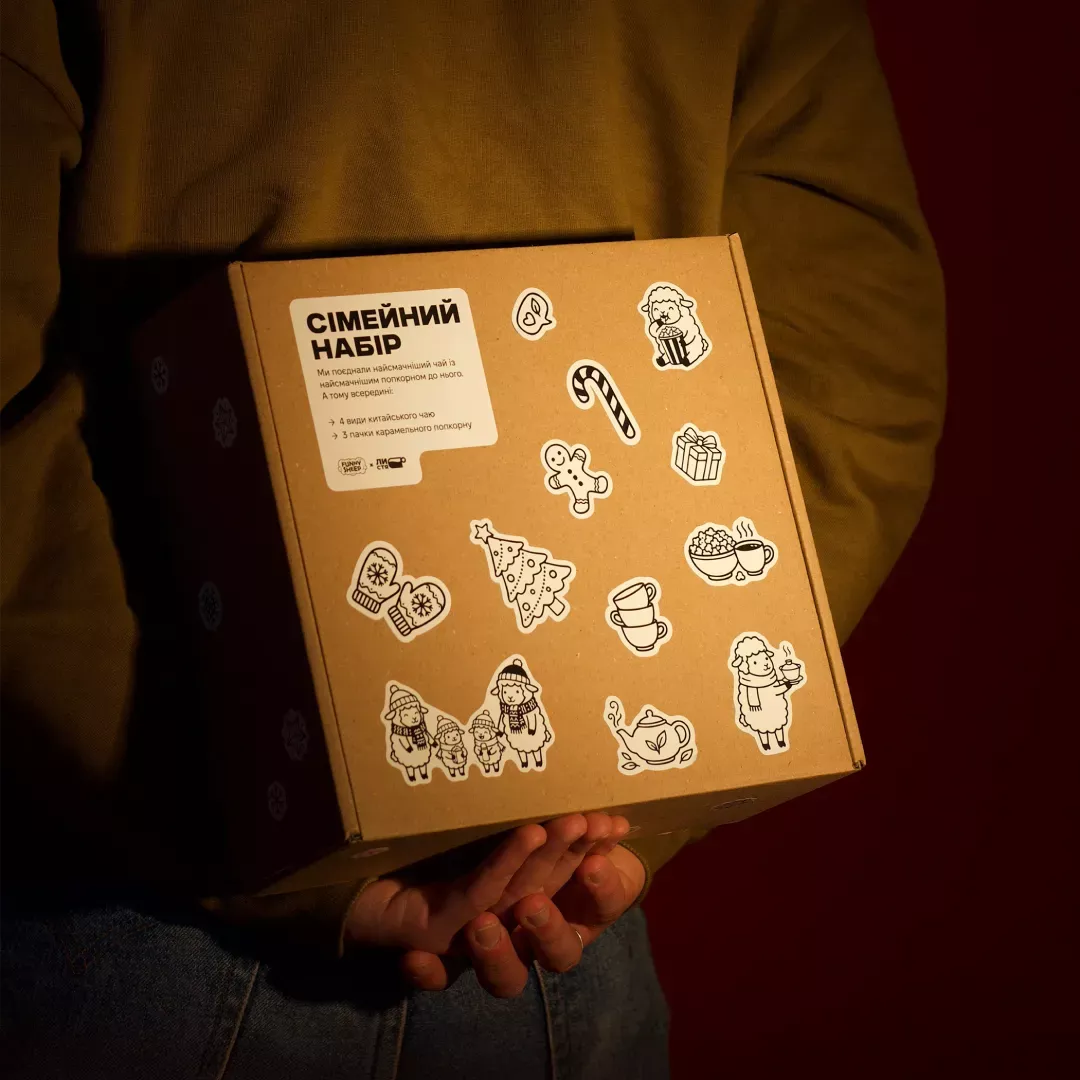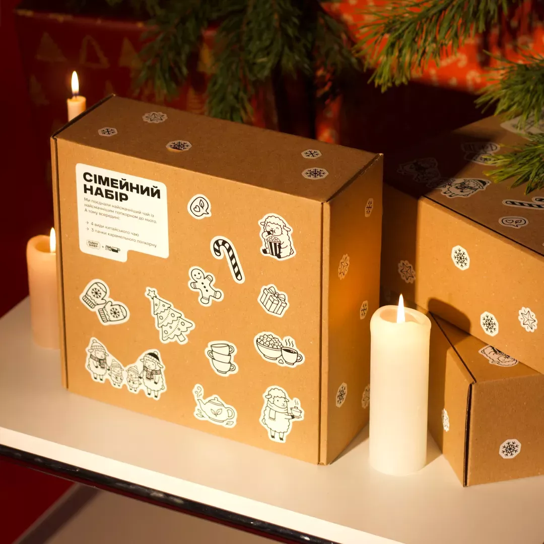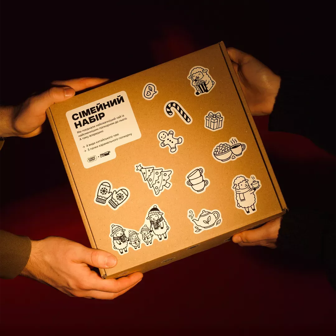 Разом ми зібрали «Сімейний набір» — бокс, усередині якого ви знайдете 4 види чаю та 3 види попкорну для різних моментів: